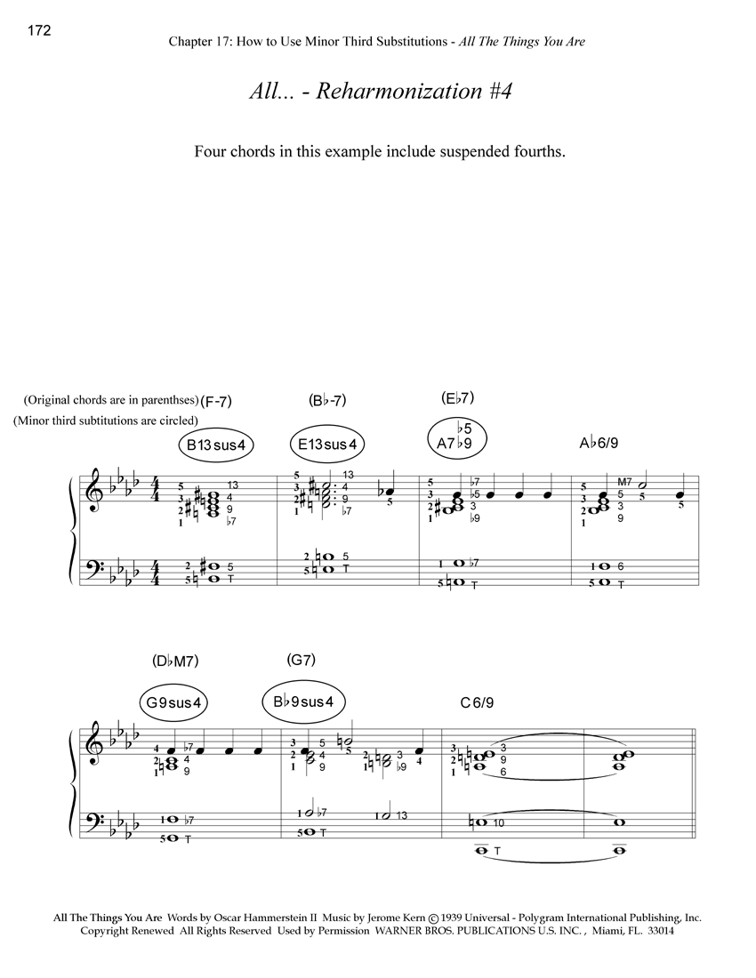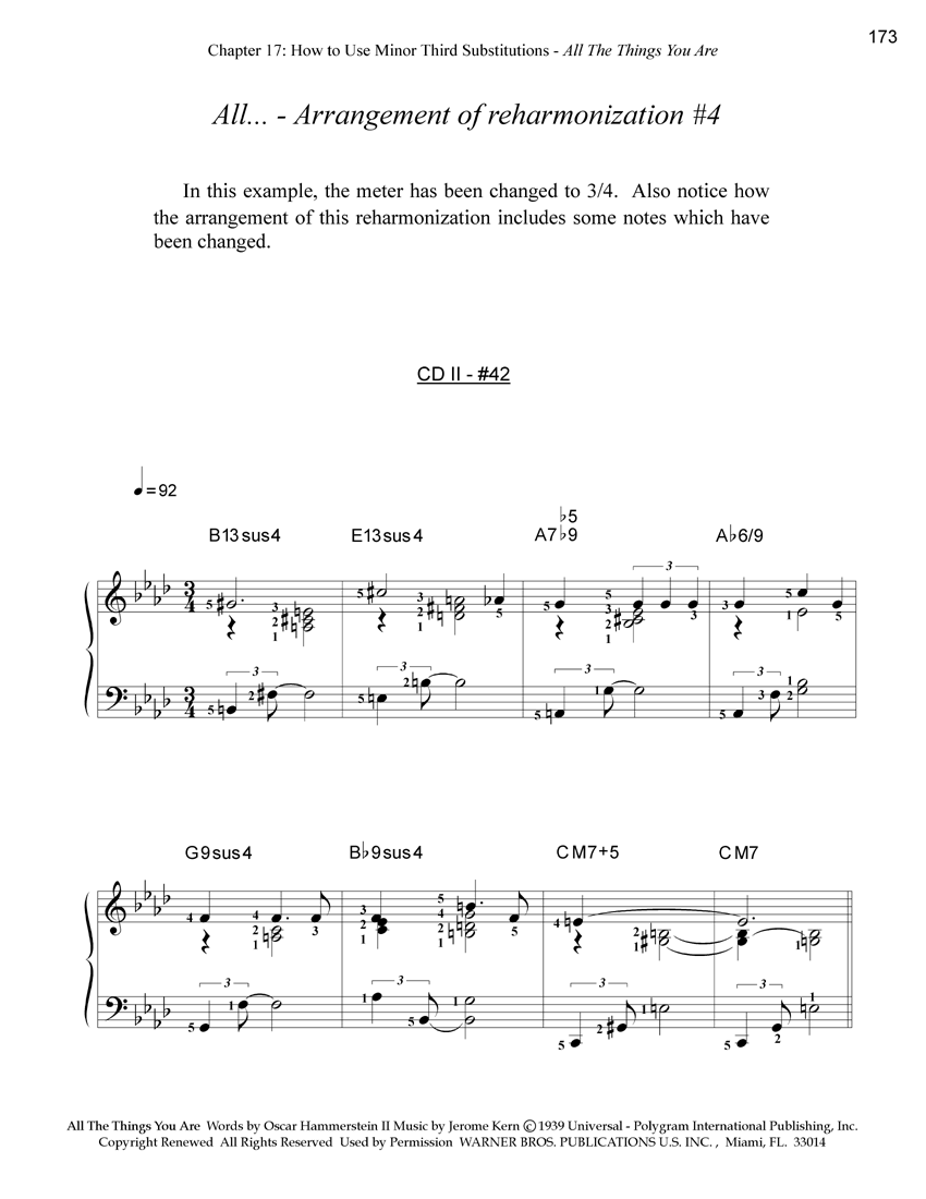 Now, instead of being limited to playing five F chords in a row, we have fourteen different chord choices for the first chord, thirteen different choices for the second chord, and four different chord choices for the third, forth, and fifth chords - but it doesn't end there - each of these chords can be voiced various different ways! The book then presents eight, reharmonized arrangements for the first five measures of It Never Entered My Mind using various combinations of the chords that were derived by our step by step procedure. Of course, every arrangement is demonstrated on the audio CD. This method is a fantastic way to develop your harmonic hearing and imagination. I believe that for pianists who are dedicated to actualizing their true harmonic abilities, this chapter, which teaches the combined use of minor third substitutions with neighboring chords, by itself, is worth the price of the entire system!