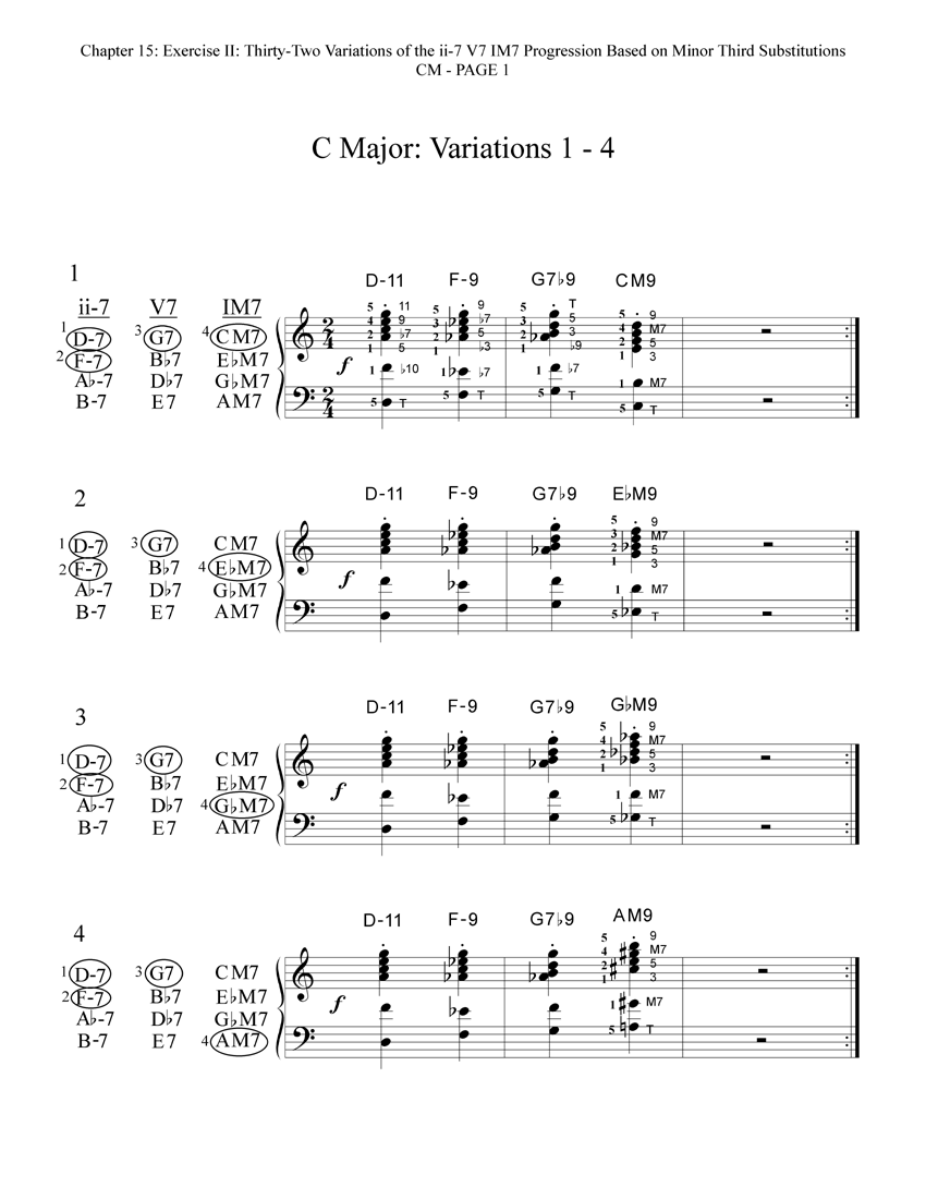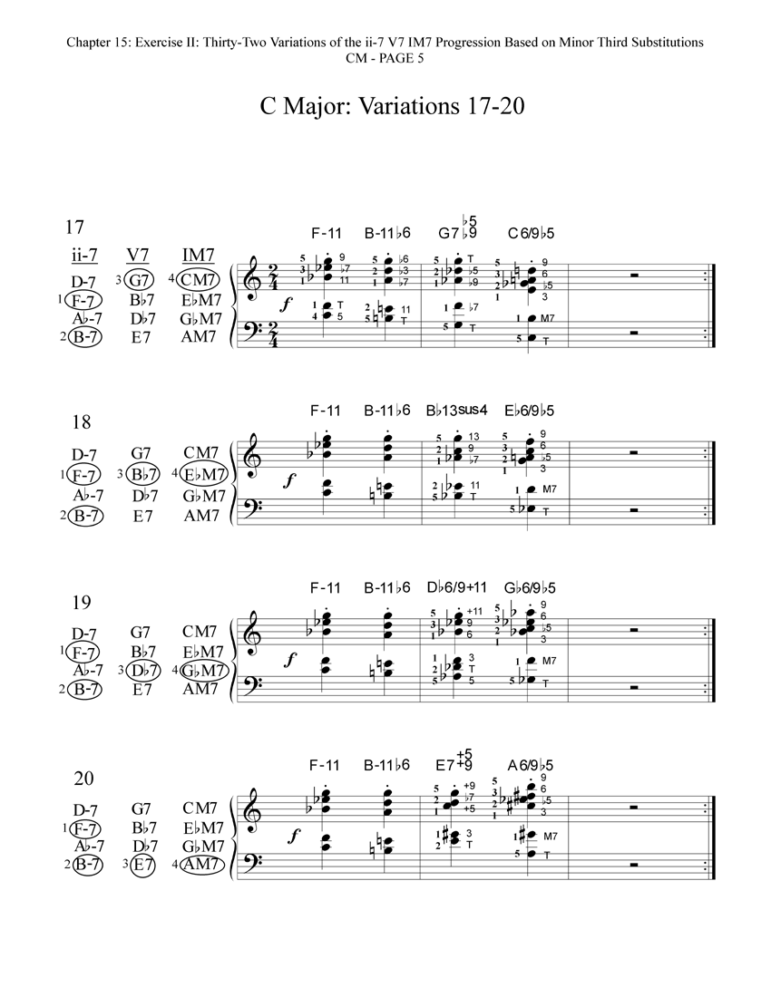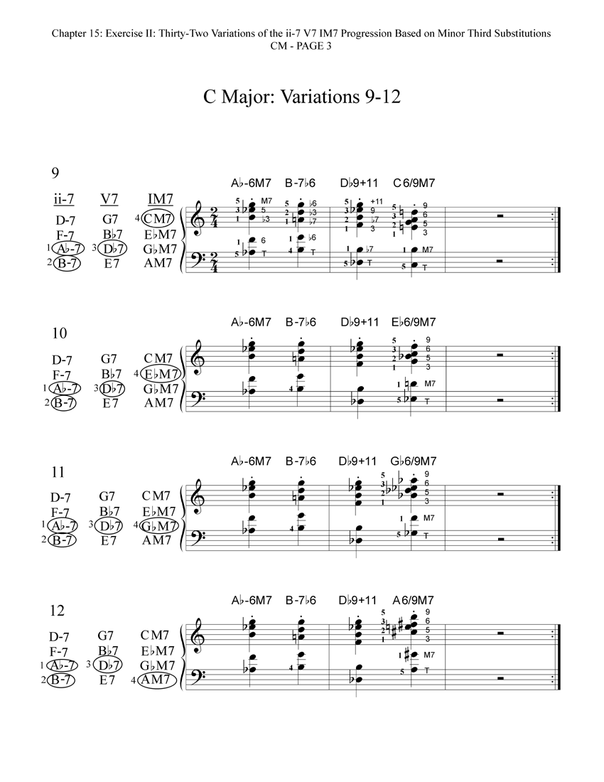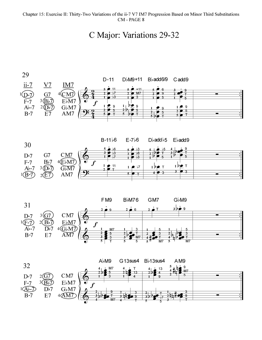 Here are the thirty-two reharmonized variations of the ii-7 V7 IM7 progression in CM. Each variation includes a diagram that shows which of the available minor third substitutions have been chosen and voiced for that particular variation. These thirty-two variations are also printed in the book in all other eleven keys!