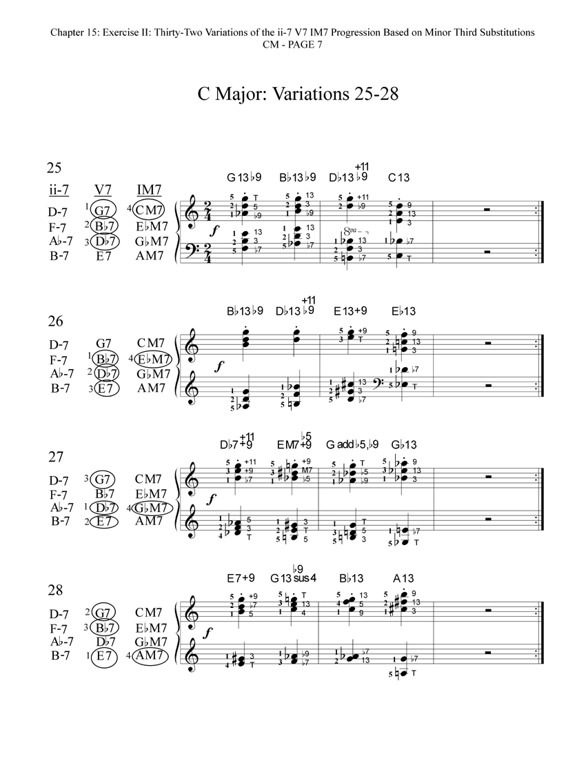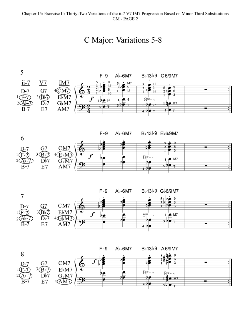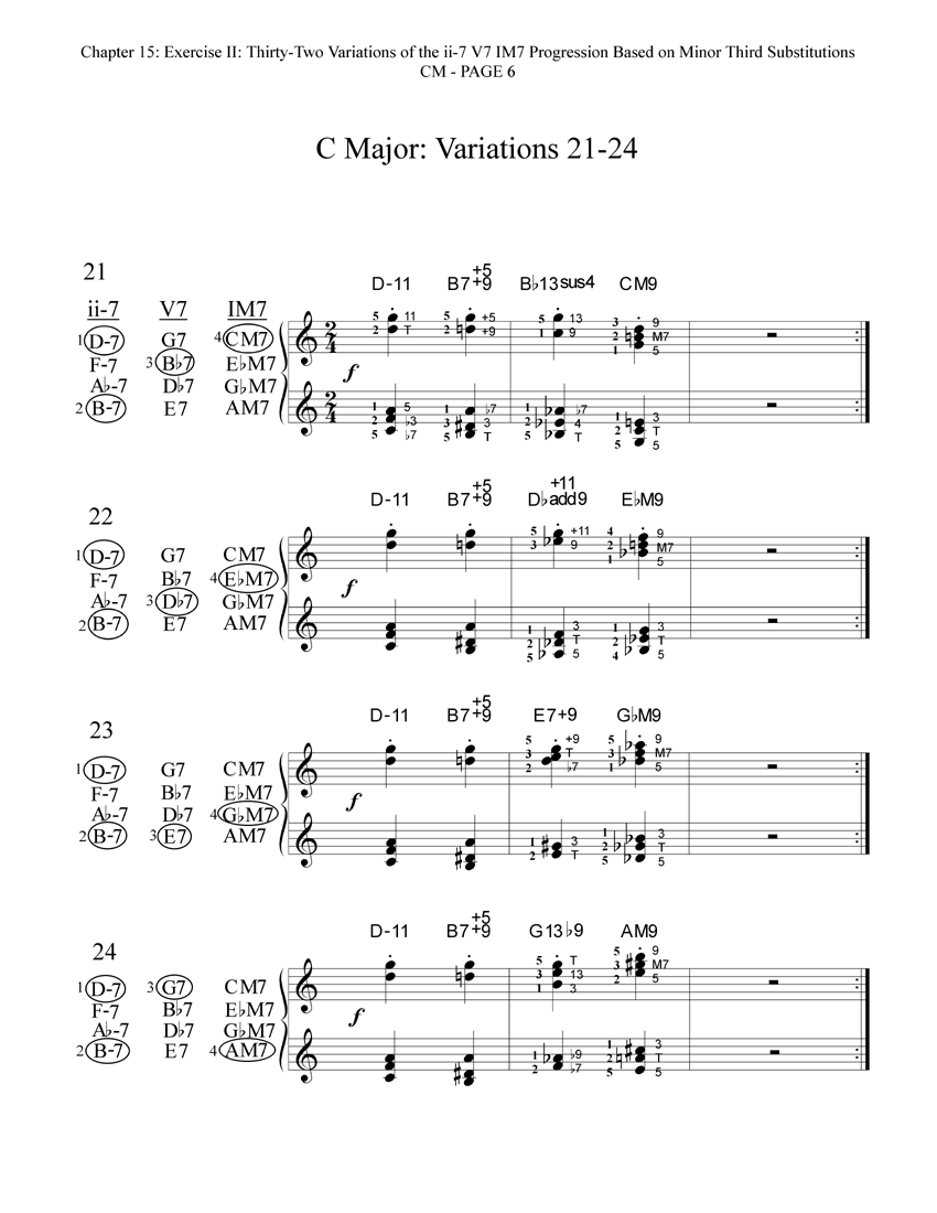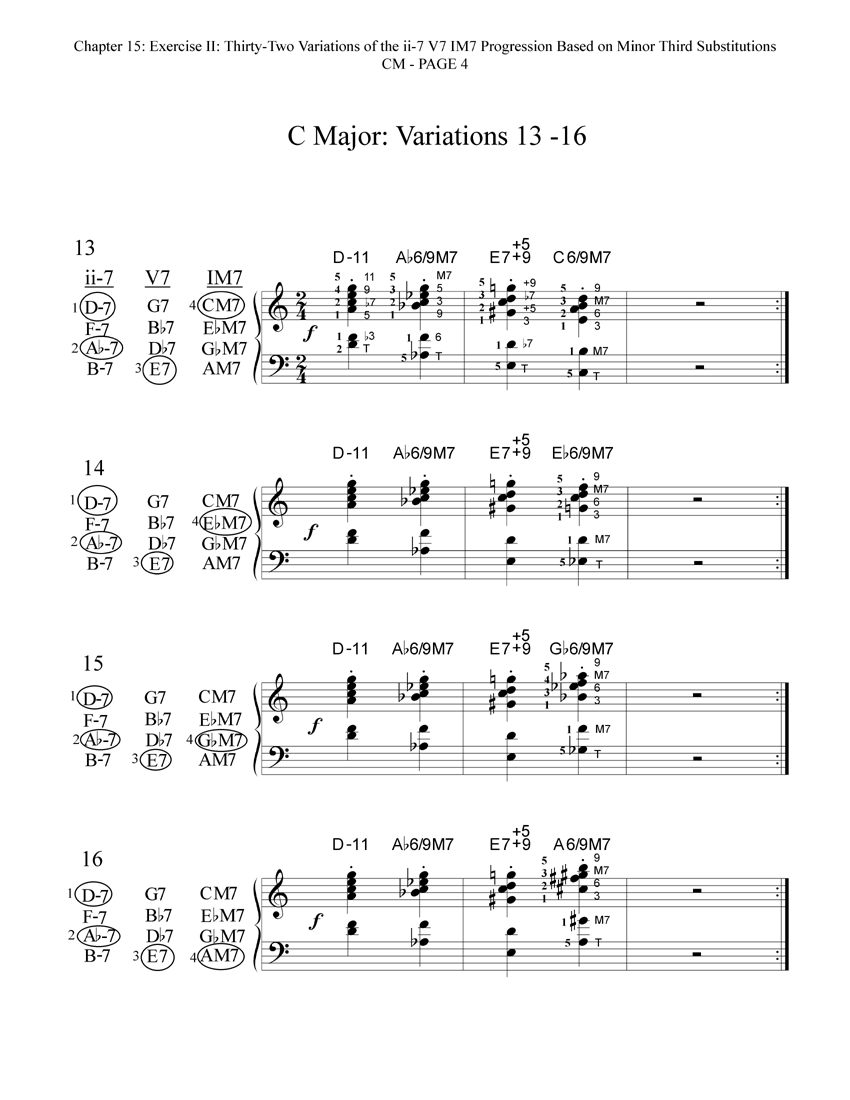 Here are the thirty-two reharmonized variations of the ii-7 V7 IM7 progression in CM. Each variation includes a diagram that shows which of the available minor third substitutions have been chosen and voiced for that particular variation. These thirty-two variations are also printed in the book in all other eleven keys!
