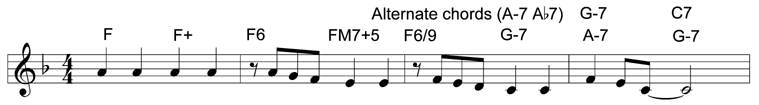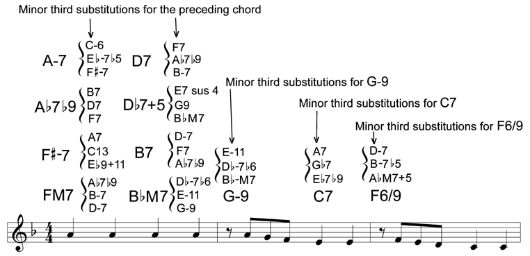 Minor third substitutions function as chord substitutions for the original chord. So, we can replace the D-7 with an F-7, Ab-7, or B-7. We can replace the G7 with a Bb7, Db7, or E7. Also, we can replace the CM7 with an EbM7, GbM7, or AM7. (How and why this method works is explained in detail in the book.)